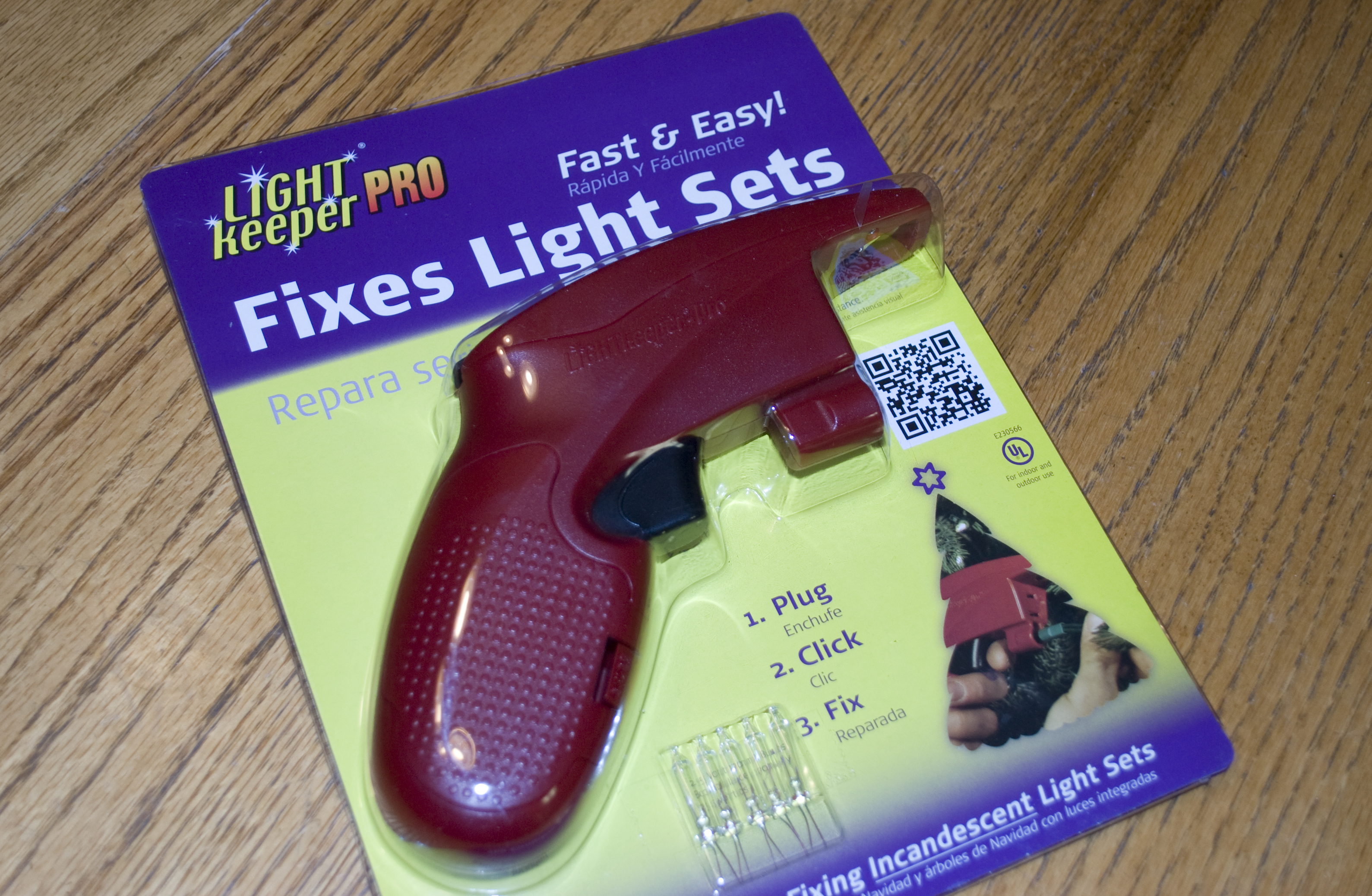 I was excited to put up our new Christmas tree because it is the pre-lit kind.  (Putting lights on the tree has been my hubby’s job, and no, he didn’t particularly enjoy it).  So, I brought the tree home from the store and put it up.  See that dark section?  Not very lovely!!!  My hubby looked and looked for the bad bulb, but that was  a nightmare since there is a coat of flocking all over the bulbs.  So I went back into the store and they told me I could take down my tree and bring it back in – OR – buy the little tool that they use and try to find the bad bulb ourselves.  I chose the latter!  It took less than three minutes to find the bad bulb with the help of this little guy.  NICE!