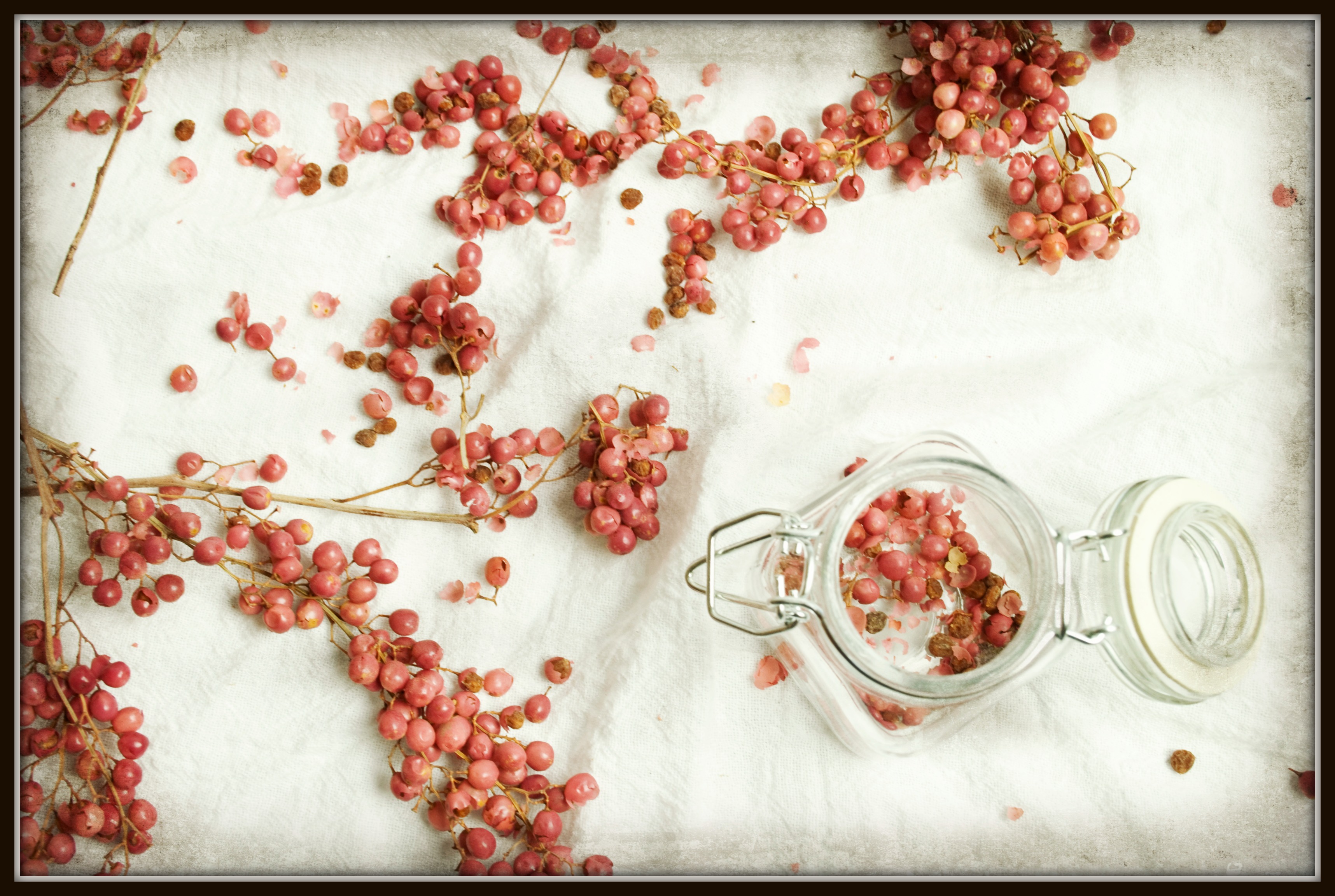 This photo is stunning, and I’m curious about what they are. At first I thought rose hips, and expected them to be redder. Possibly they are berries instead. Either way, they’re gorgeously pink.