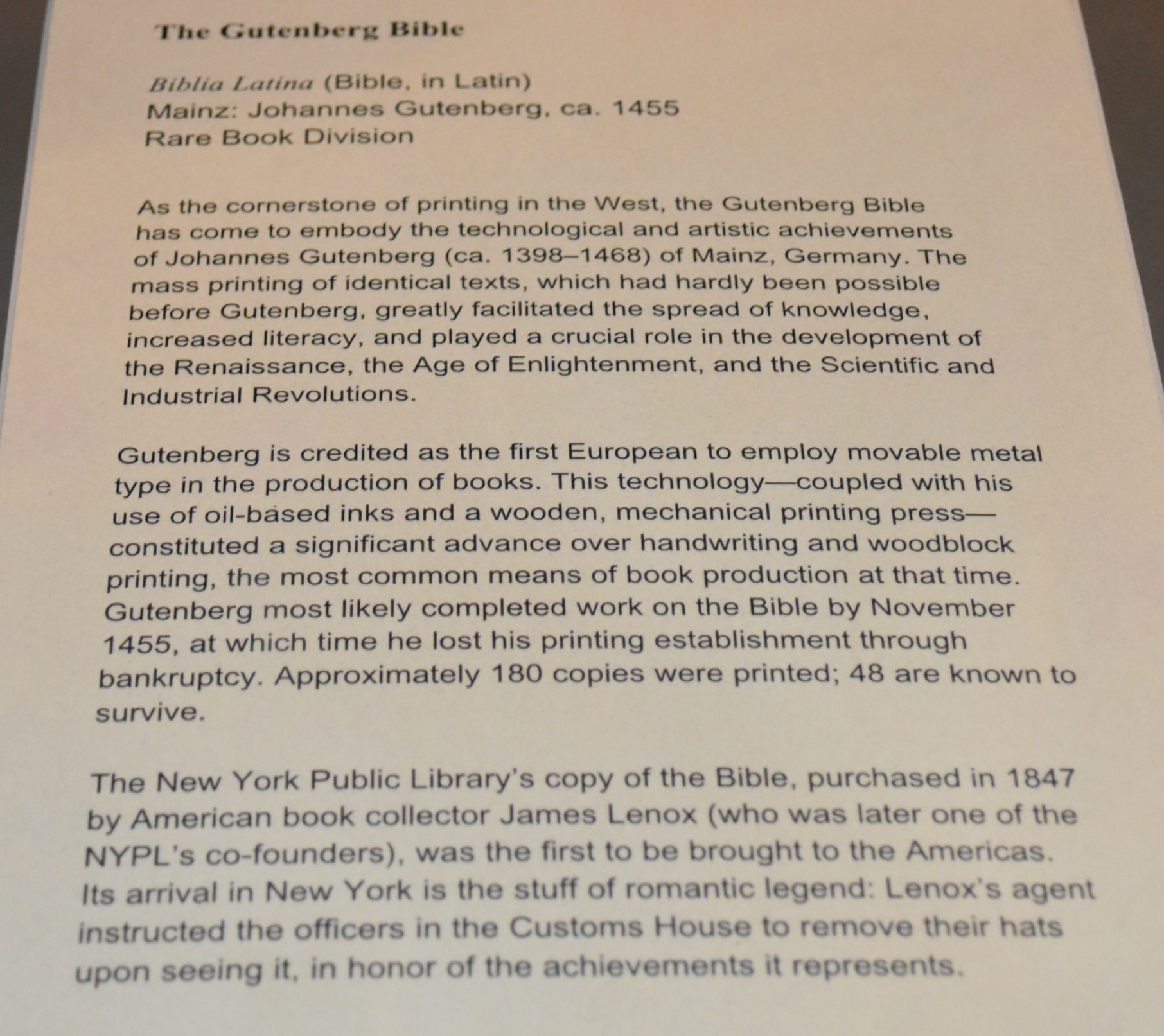 Happy Sunday! This photo is simply a snapshot of an original Gutenberg Bible that we saw in the New York Public Library recently.  It’s hard to get impressive photographs from behind a glaring glass box and florescent library lighting.  Sorry about that!…and the display write up (below) is even worse quality – but if you click on it, you can probably read it ok. It was interesting.