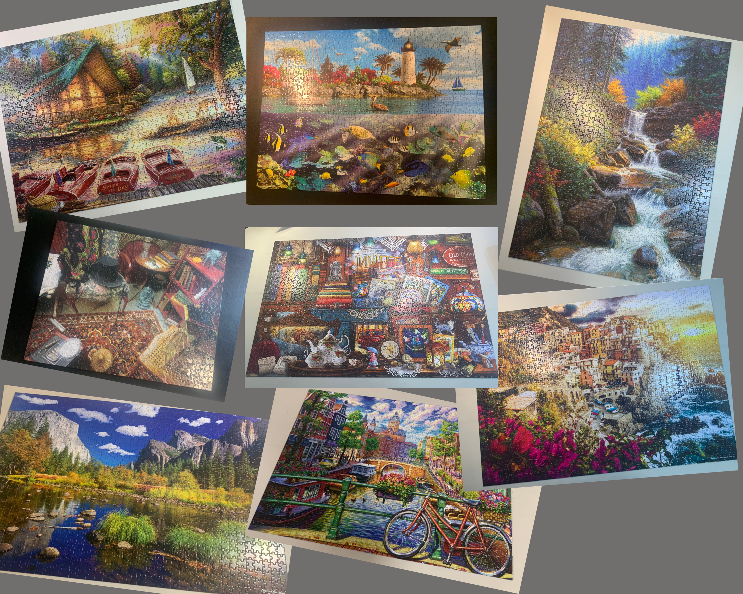 1. I’ve always been a lover of jigsaw puzzles. We have two going on our dining room table. It’s the one activity that holds my focus and keeps me sitting still. With my mother in the advanced stage of Alzheimer’s I make a point of puzzling each day. Your puzzles are beautiful!