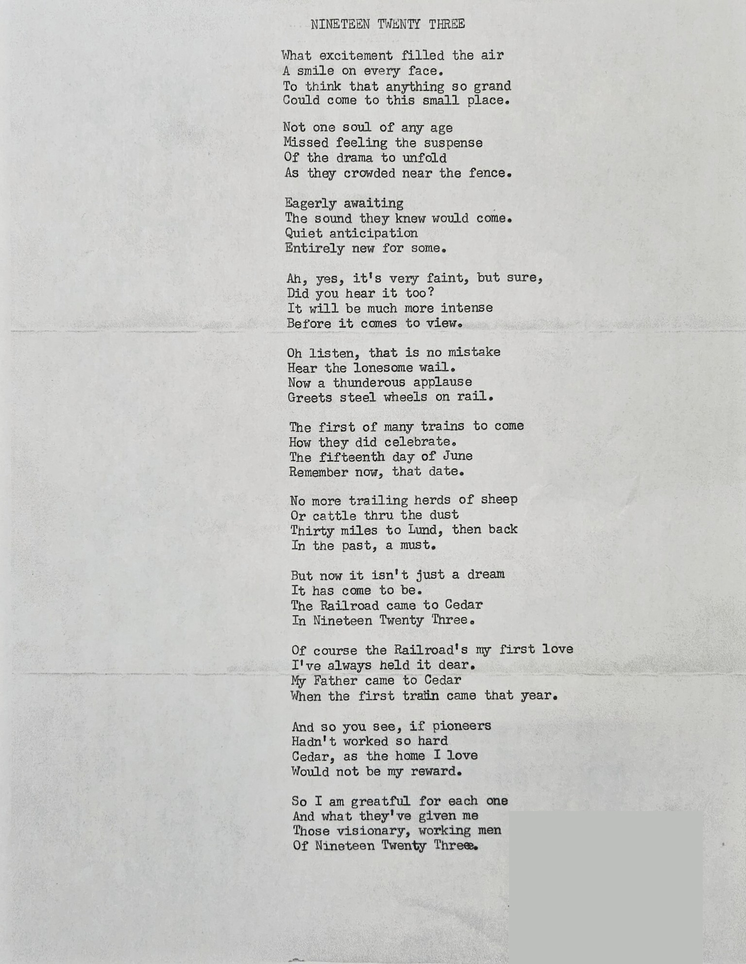 The first day of the year is almost over. I wasn’t planning on posting anything, but I just became aware of #JusJoJan24 and today’s prompt of “Train” and decided I must play along. My mother wrote this poem many years ago about how the train came to her little town in 1923. That same little town celebrated its 100 anniversary of the train coming last summer and featured Mom’s poem in the celebration. She passed away in 2020, but some city official apparently had a copy of this poem in their files.