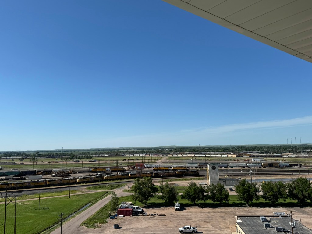 Observing: the world’s largest train yard from the observation deck of the Golden Spike Tower in North Platte, Nebraska. The train yard is 8 miles long and about 2 miles wide.