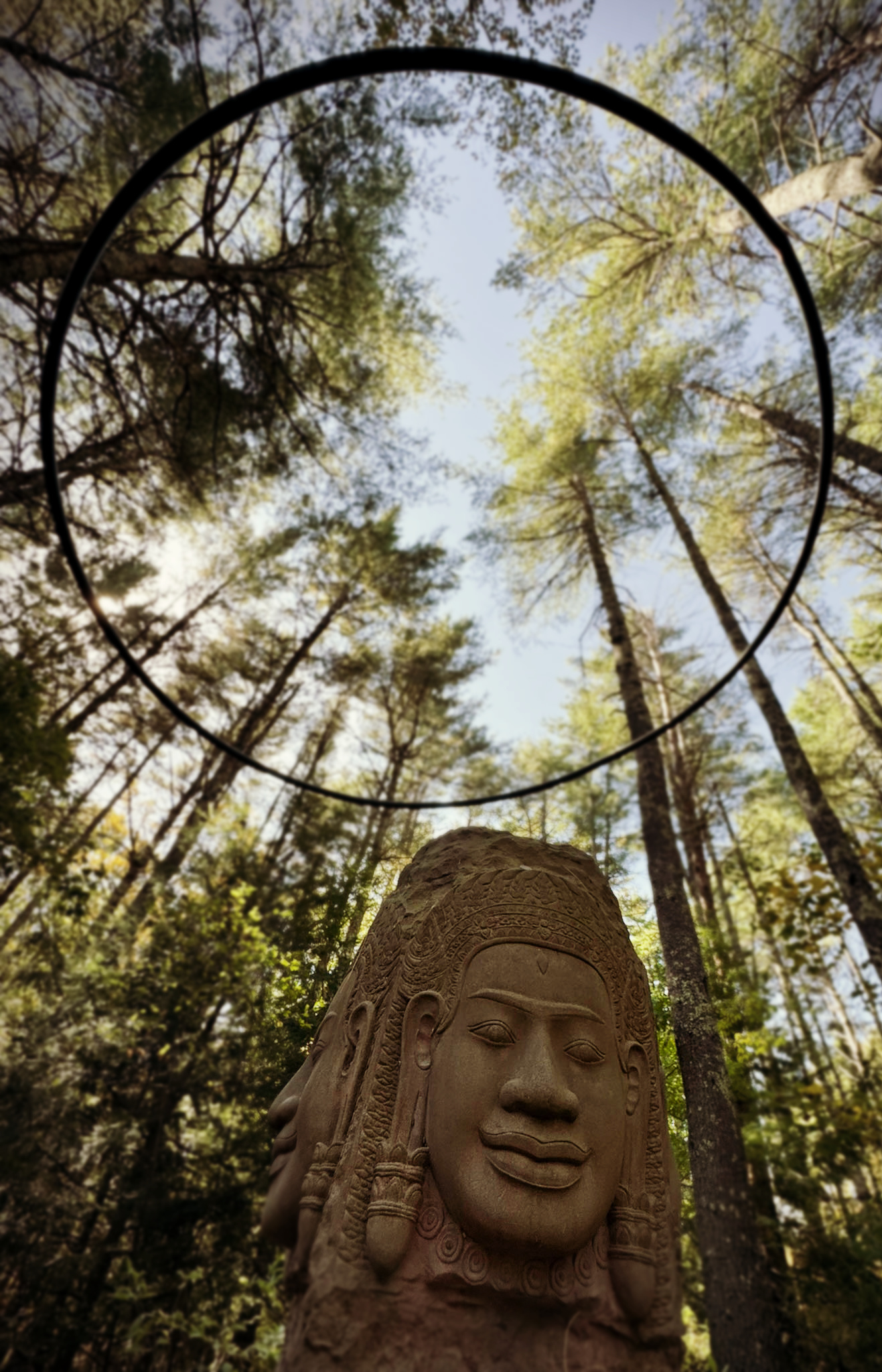 This is a four-faced Buddha surrounded by a suspended halo at Bedrock Gardens in Lee, New Hampshire.