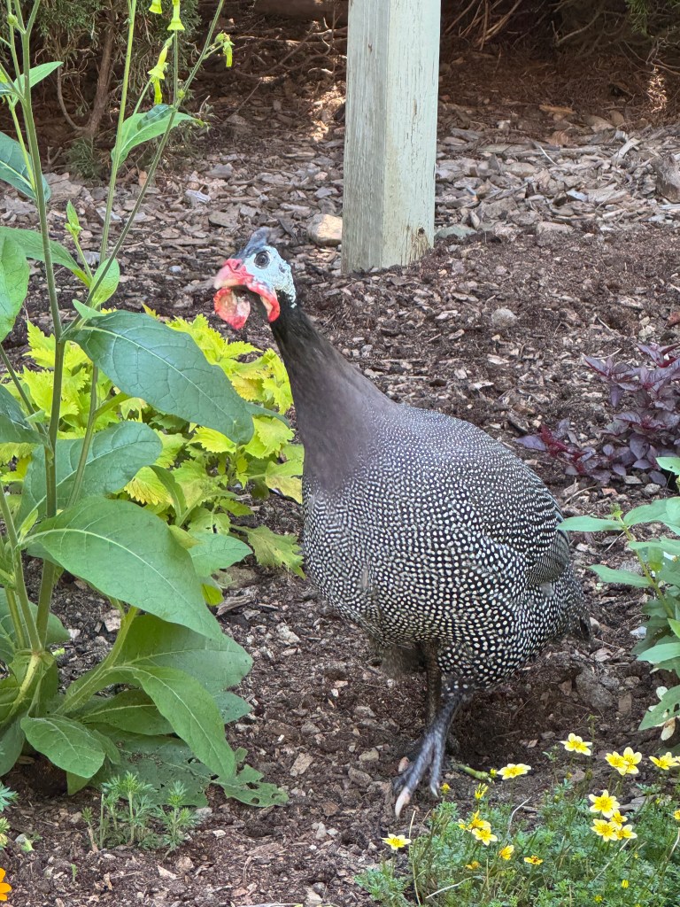 F: Followed around by a guinea hen! As we visited a botanical garden in Rhode Island, something that looked sort of like a small, funny-looking turkey or pheasant was following us around. We later found out it was a guinea hen!
