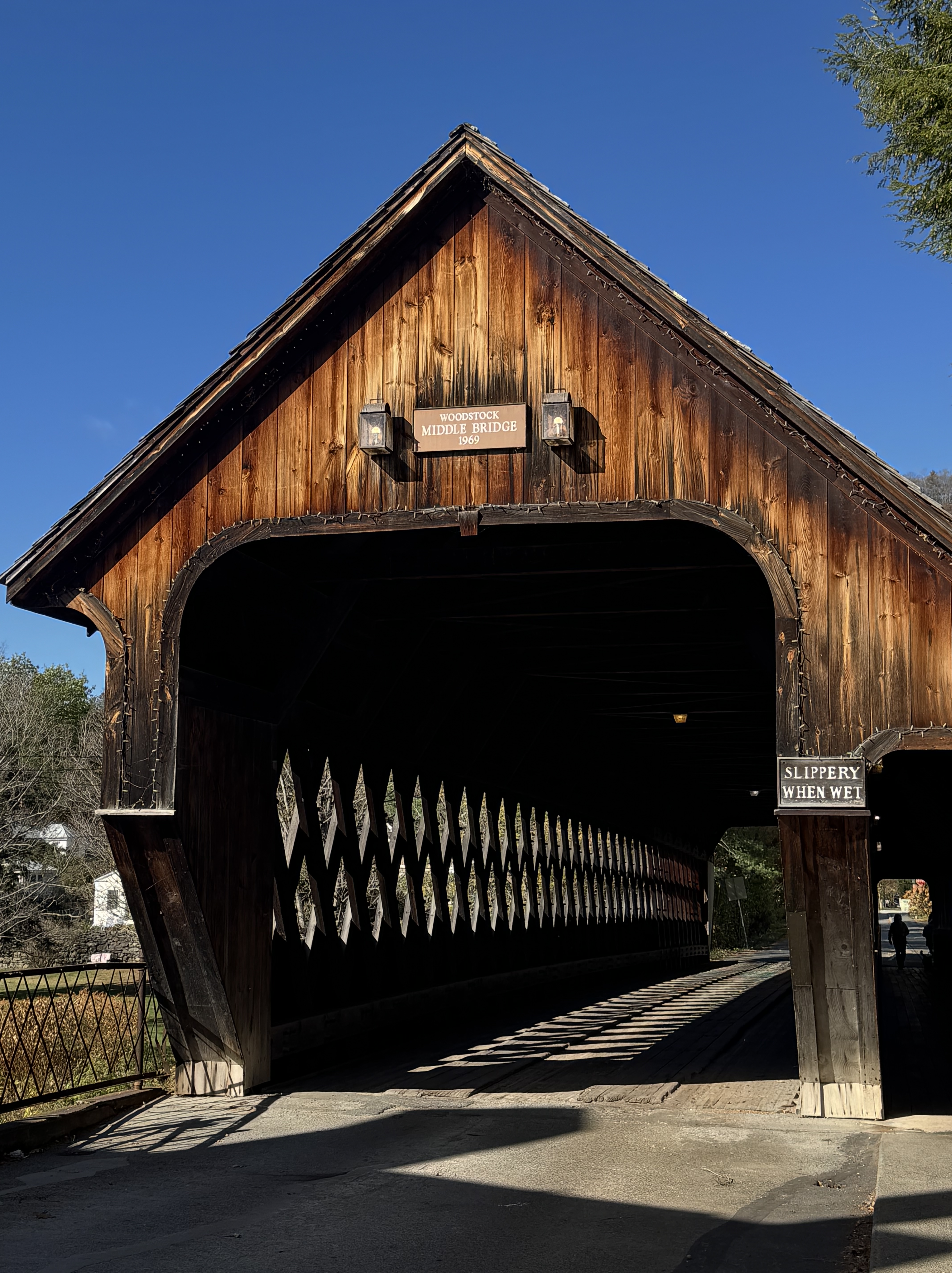 B: “Bridging”… I learned a NEW term! One afternoon, as we traveled around Vermont, looking at many of its historic covered bridges, we were listening to a podcast about them. The president of the Vermont Covered Bridges Society used this term. She would say something like, “When I go bridging, I always…”