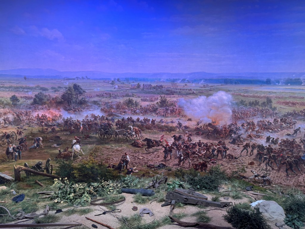 C: Cyclorama. We saw this cyclorama at Gettysburg, Pennsylvania. A cyclorama is a large, curved backdrop or wall used in theaters, film sets, and studios to create an illusion of open space or an infinite background. This 360-degree scene on the cyclorama at the Gettysburg visitors’ center was painted by a French artist in 1883 and traveled to exhibitions like the Chicago World Fair.