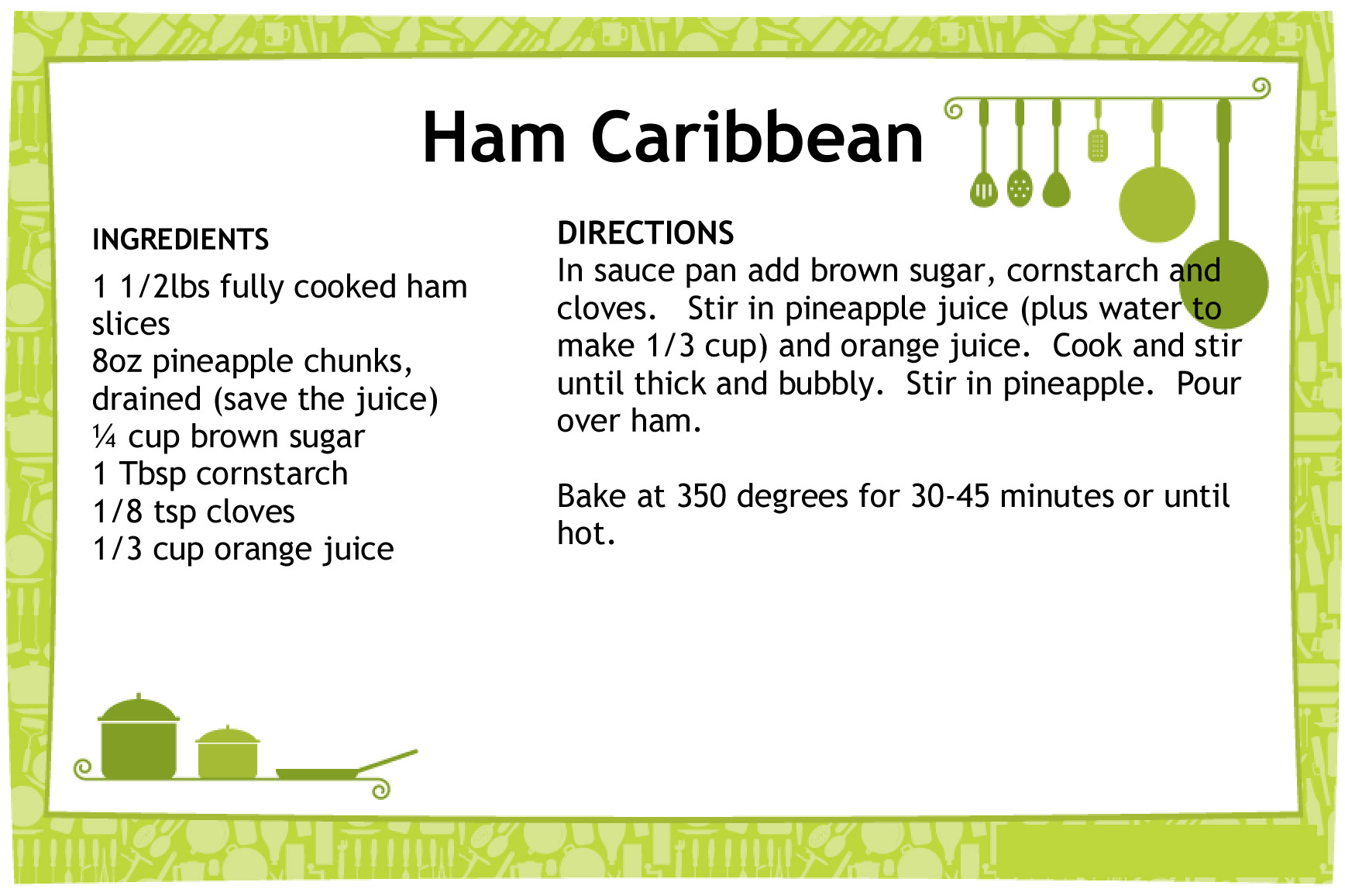 Wow! I really have no idea where the last few weeks have gone. I have no excuses for not posting on my little blog here…I haven’t been out of town, I haven’t been overly busy on some huge project…..just normal life. BUT, today I HAD to share this very yummy ham recipe. My friend and I had our monthly F&F TIME yesterday and instead of putting this dish in the freezer, we had it for dinner last night. YUM!!! I even had some for breakfast this morning, it was THAT good (the pineapple was especially yummy cold from being refrigerated all night). Here’s the recipe: