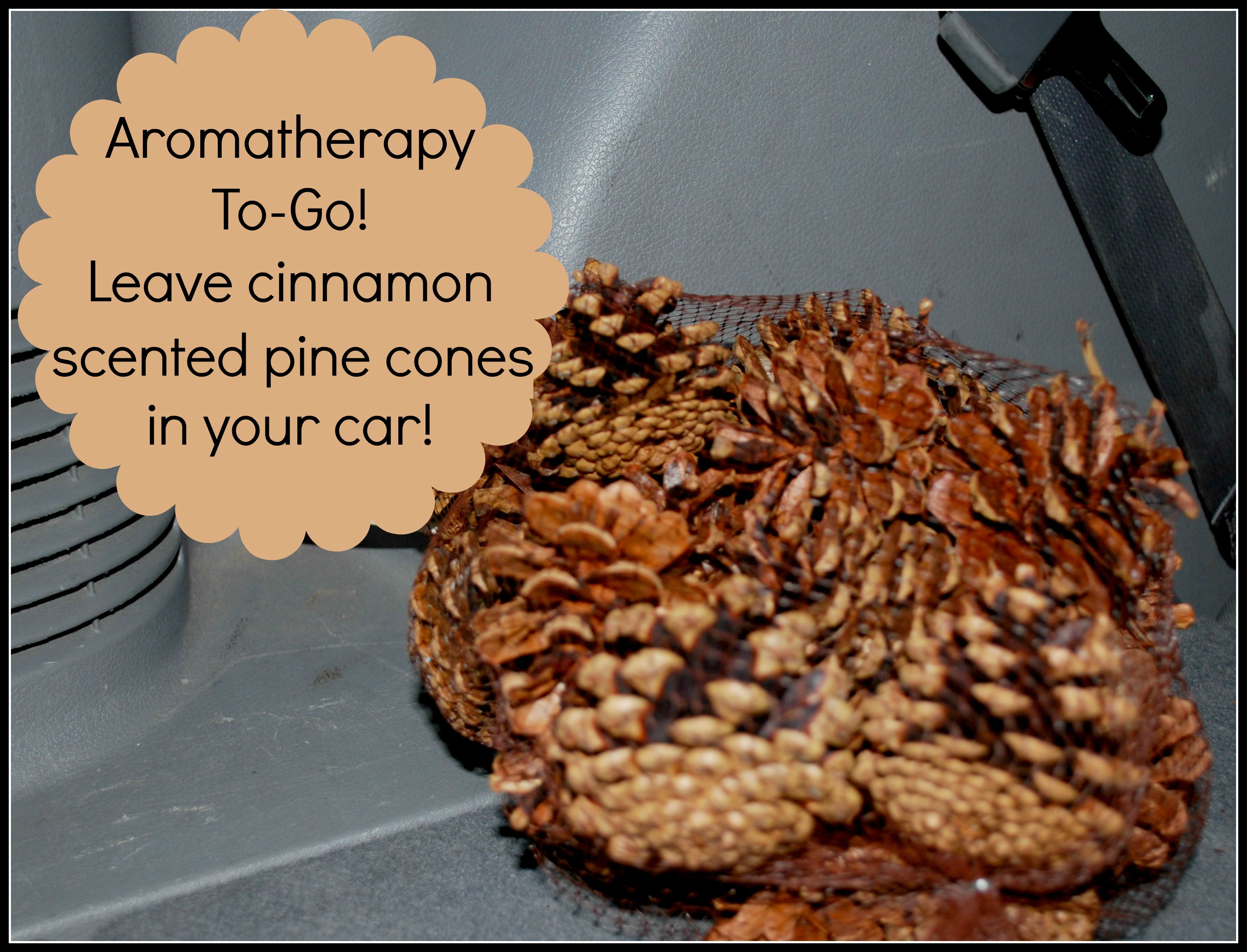 Hi all! So it’s THAT time of year again!….the time when you can find cinnamon-scented pine cones in your grocery store 🙂 Yeah! I LOVE the smell of cinnamon! And I love having my car smell good. I typically buy the tree-shaped air fresheners that last…oh what?…maybe 2 or 3 days? But I recently bought these pine cones and left them in the back seat of my car…and ummmm! They still smell really good! Try it out!