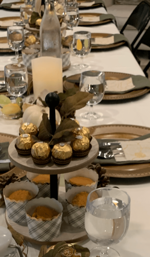 Isn’t this a fun tablescape? My friend hosted an event at her house recently and I had to post about this NEW (to me), incredibly yummy Pumpkin Crunch recipe. See the little cupcake holders under the Ferrero Rocher chocolates? Instead of cupcakes, she put in some Pumpkin Crunch dessert. Then, when it was time for dessert, she just passed around a can of spray whip cream for people to put on top of the crunch. How easy and perfect is that?!?